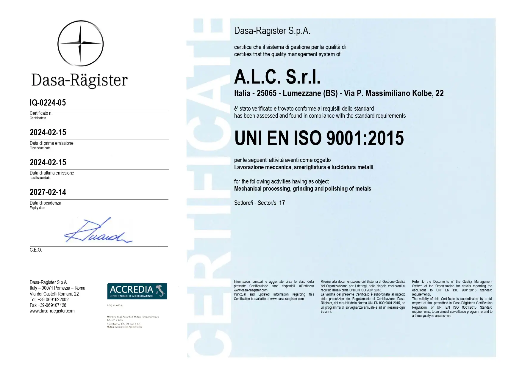 In ALC Srl la qualità non è solo un requisito formale, ma un impegno quotidiano. La certificazione ISO 9001 testimonia la nostra attenzione a ogni fase del processo produttivo: dalla selezione dei materiali al controllo delle lavorazioni, fino alla consegna del prodotto finito.